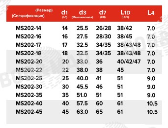| Размер, спецификация | d1, мм | d3, мм | d7, мм | L1D, мм | L4, мм |